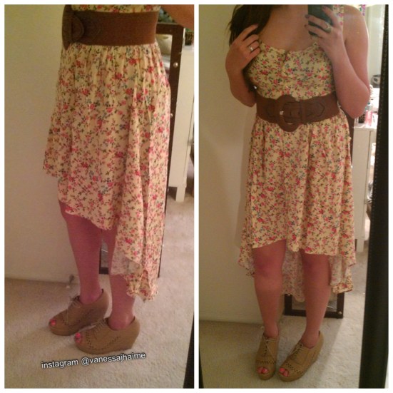 I bought this ‘Ditzy’ dress from Forever 21 for $24.80, and it’s perfect for the summer. I paired it with a brown belt to create a focal point since it’s a printed dress so it doesn’t look so busy and some cute tan lace up peep-toe wedges (also from Forever 21 for $29.80). You can easily accessorize this dress with some cute bracelets (arm candy!) or a gorgeous necklace.