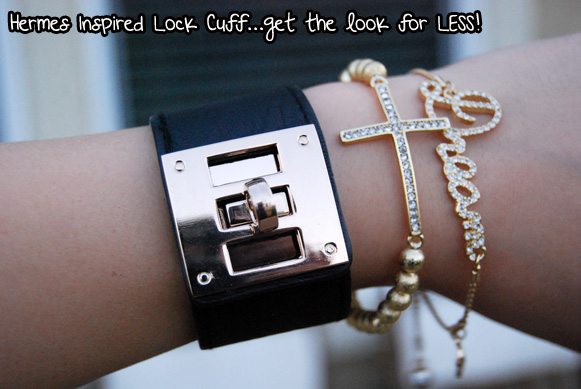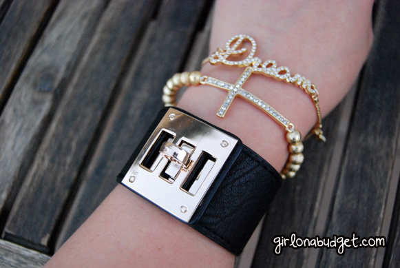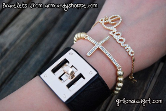 Ever since I got on Instagram, I have been constantly drooling over the pictures Armcandyshoppe posts because all the bracelets are just super cute and different! I decided to get the beaded cross bracelet in gold ($12.99), which sits nice and dainty on the wrist because it’s not too big or too blingy, but definitely is eye catching; the gold bling bracelet in “Dream” (since I could not find those damn BCBG bracelets that say “Dream”! $11.99), and a Hermes Inspired Cuff in Black (and gold metal) for $19.99.