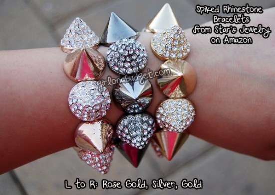 A lot of people on Instagram have been asking me where I got my spiked rhinestone bracelets, I bought them off of Amazon (if you search for “spiked rhinestone bracelets” they should pop up), the seller is Star’s Jewelry. They are $14.99 each and Amazon had a deal where if you spent over $30 you would get free shipping.They are very durable meaning they do not feel cheap and have some weight to it). I bought them in 3 colors: Rose Gold, Silver, and Gold. HOWEVER, the “silver” was actually the black rhodium, and they sent me the wrong one and didn’t realize it till recently, so the middle one in the picture is NOT in fact the silver, but the black rhodium. Just wanted to make it clear in case you order silver and actually get the lighter version.